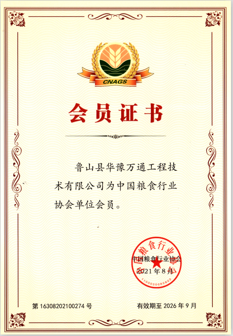 2021年8月,中国粮食行业协会多方位考察,授予鲁山县AG电子工程技术有限公司评会员单位称号,并颁发会员单位证书